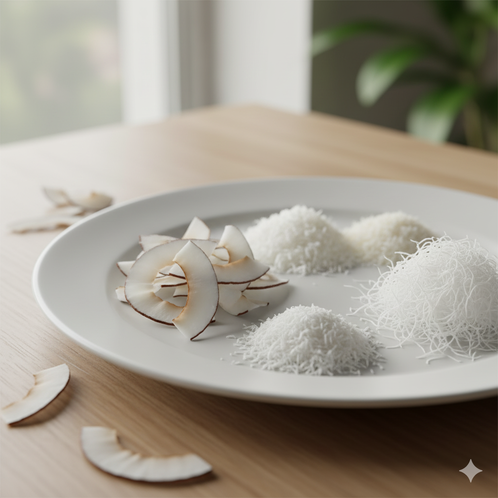 These are different cut sizes of dried coconut meat – flakes (large), shreds (medium), and threads/twine (long, string-like). They provide texture, flavor, and visual appeal, widely used for garnishing and snacking.