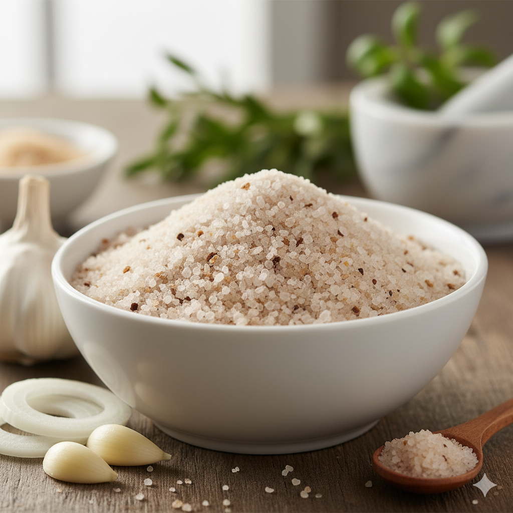 • Fine salt infused with garlic extract.