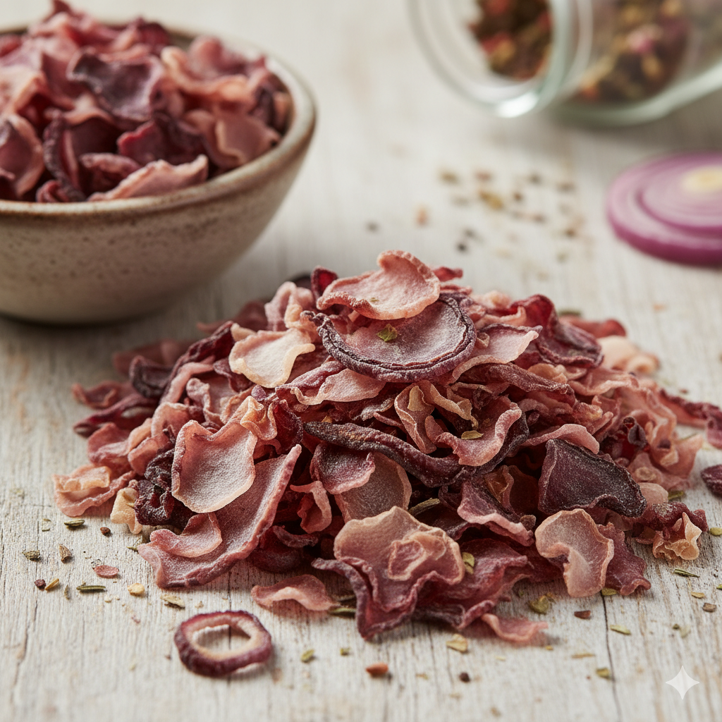 Dehydrated red onions are rich in antioxidants like quercetin, which help preserve color and enhance taste. One kilogram of red kibbled onions equals approximately 10 kilograms of fresh onions when rehydrated.