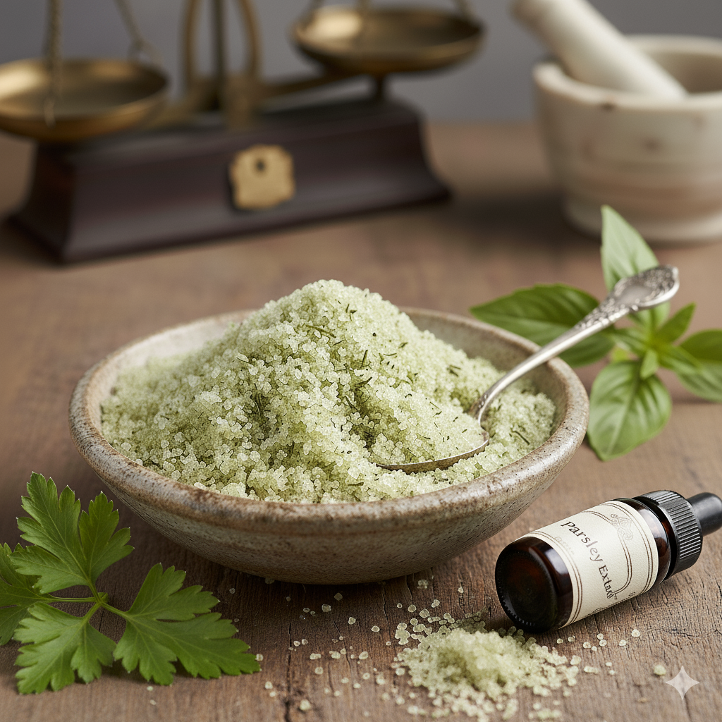 Parsley, with its fresh, mild, and slightly peppery taste, is one of the most versatile herbs in global cooking. Salt infused with parsley extract provides a bright, green note that enhances the natural flavors of food without overwhelming them.