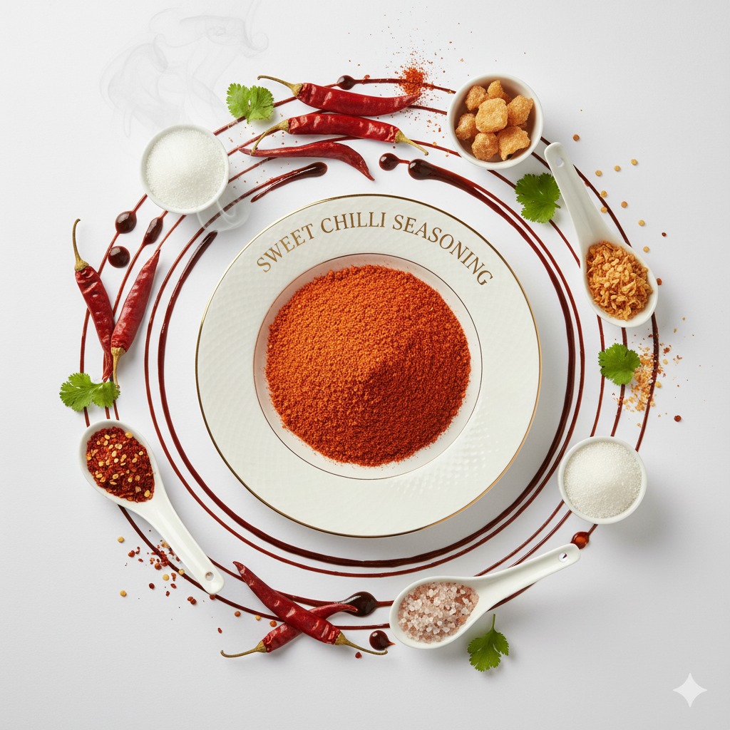 Sweet Chilli Seasoning brings together the heat of chili with the sweetness of sugar, reflecting the popular Thai dipping sauce flavor. The blend balances fiery spice with caramel-like sweetness, creating an addictive seasoning for glazing, stir-frying, or topping snacks. Its universal appeal comes from the combination of sweet and spicy in equal measure.